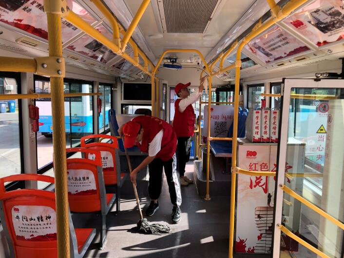 一大早,志愿者們便來到71路停靠的航華苑首末站一起動手給車輛進行徹底打掃。每臺車回來后,都會停在指定位置,大家幫忙擦玻璃、拖地面、給車輛扶手擦拭消毒,忙的不亦樂乎,確保每臺車都漂漂亮亮的。