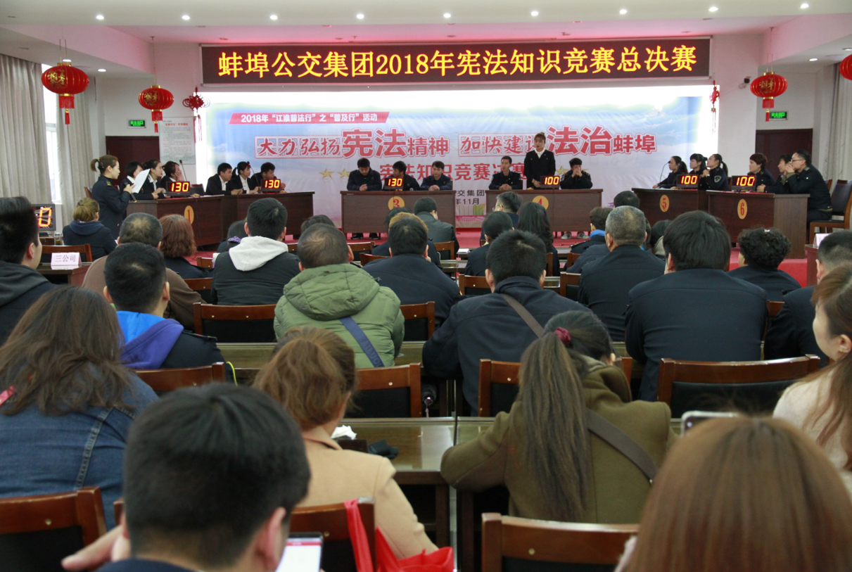 為做好《憲法修正案》的學習宣傳工作,進一步加深廣大員工的憲法意識, 11月7日,公交集團以“大力弘揚憲法精神,加快建設法治蚌埠”為主題的 2018年憲法知識競賽圓滿落幕。來自集團公司的14支代表隊參加競賽,經過筆試預賽,6支代表隊脫穎而出,進入當天的決賽。