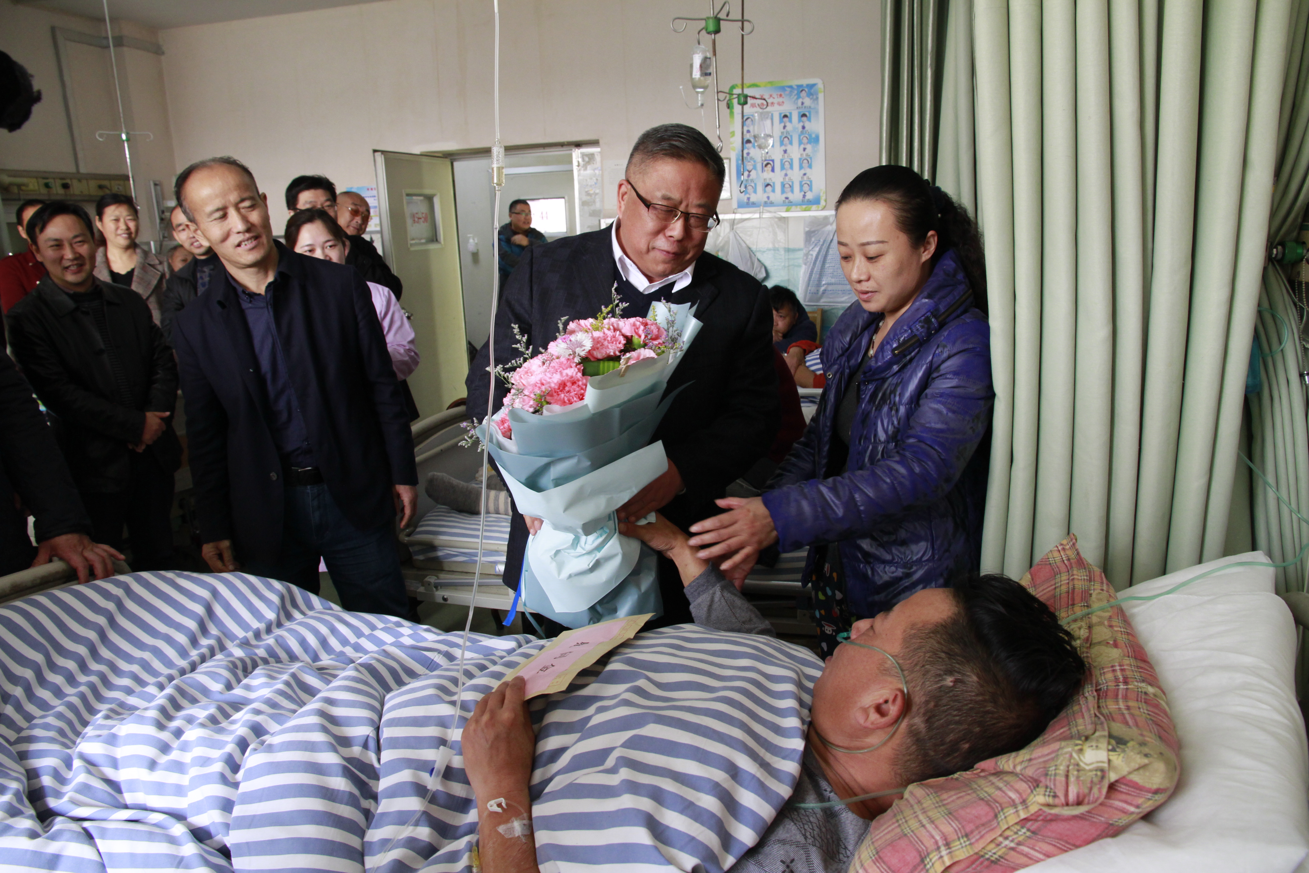 在CCU病房里,當看到轉危為安的戴勝利,呂局長代表市交通運輸局黨委向他表示親切慰問,并向其送上慰問金和鮮花,叮囑其安心休養,爭取早日康復,同時呂局長對蚌醫二附院醫生護士及時的精心救治表示感謝。呂局長強調,戴勝利同志在最危機時刻,強忍劇痛,拉好手剎,把車輛安全停靠路邊,確保乘客的安全,實屬可貴。其行為傳遞了社會正能量,是公交的驕傲,也是交通系統的驕傲。