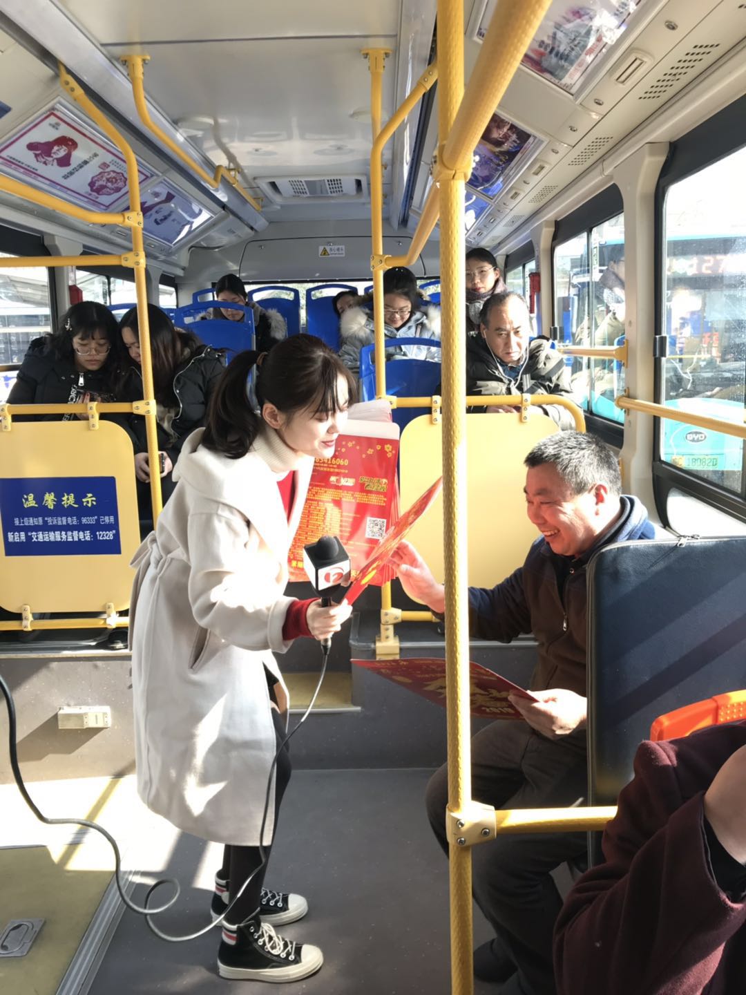 安徽電視臺“第一時間”欄目組來蚌 為一線公交駕駛員送春聯 1月23日上午,安徽電視臺“第一時間”欄目組來到蚌埠市高鐵南站公交樞紐站開展“迎豬年,送春聯”活動。欄目組看望慰問了一線公交駕駛員,并給他們送上春聯,向他們道一聲新春祝福,感謝他們為市民出行提供了便捷保障,駕駛員對于欄目組的到來感到非常意外,也很驚喜。隨后,欄目組還為乘坐公交車的市民送上了春聯。