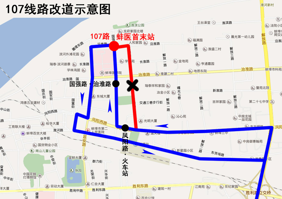 107路公交車改道公告 因交通路(鳳陽路至圈堤路)封閉施工,2019年4月13日起,公交107路濱湖新區至蚌醫首末站方向改道為:原線路—鳳陽路—國強路—蚌醫首末站。蚌醫首末站至濱湖新區方向保持不變。 改道期間公交車將取消停靠“交通路•火車站”、“交通路•光明街”、“地方海事局”站。臨時停靠“鳳陽路•火車站”、“國強路•治淮路”站,封閉施工結束后恢復原線。