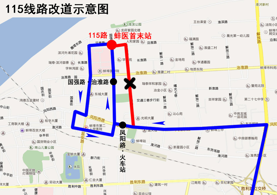 115路公交車改道公告 因交通路(鳳陽路至圈堤路)封閉施工,2019年4月13日起,公交115路高鐵南站至蚌醫(yī)首末站方向改道為:原線路—鳳陽路—國強路—蚌醫(yī)首末站。蚌醫(yī)首末站至高鐵南站方向保持不變。 改道期間公交車將取消停靠“交通路•火車站”、“交通路•光明街”、“地方海事局”站。臨時停靠“鳳陽路•火車站”、“國強路•治淮路”站,封閉施工結(jié)束后恢復(fù)原線。