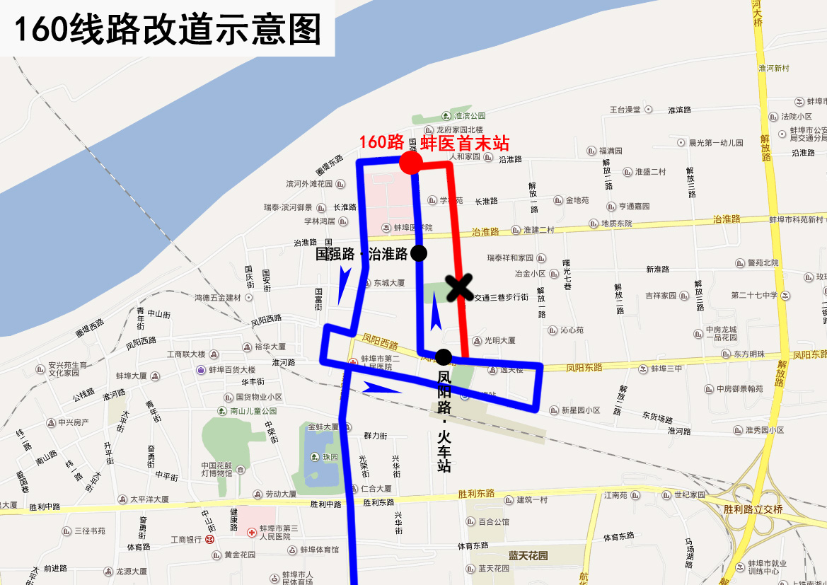 160路公交車改道公告 因交通路(鳳陽路至圈堤路)封閉施工,2019年4月13日起,公交160路延安南路至蚌醫首末站方向改道為:原線路—淮河路—解放一路—鳳陽路—國強路—蚌醫首末站。蚌醫首末站至延安南路方向保持不變。 改道期間公交車將取消???ldquo;國強路•火車站”、“交通路•火車站”、“交通路•光明街”、“地方海事局”站。臨時???ldquo;鳳陽路•火車站”、“國強路•治淮路”站,封閉施工結束后恢復原線。