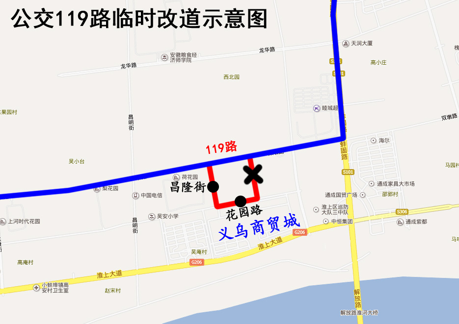 119路公交車臨時改道公告 因花園路(永平街至昌平街)封閉施工,2019年4月18日起,公交119路來回雙向改道為:原線路—雙墩路—解放路—原線路。 改道期間公交車將取消停靠“昌隆街”、“花園路”站。封閉施工結束后恢復原線。