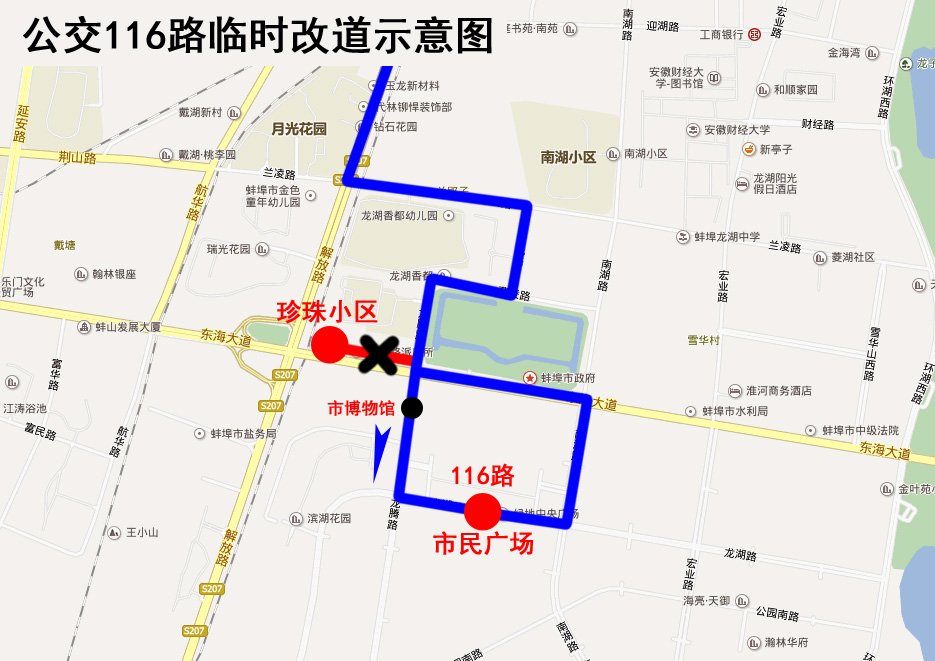 116路公交車臨時改道公告 由于珍珠小區(qū)首末站門口道路封閉施工,2019年4月17日起,公交116路珍珠小區(qū)首末站遷至市博物館南門市民廣場處臨時停靠。線路走向為:原線路—龍騰路—行湖路—南湖路—東海大道—龍騰路—原線路。 改道期間公交車將臨時停靠“市博物館”、“市民廣場”站,封閉施工結束后恢復原線。