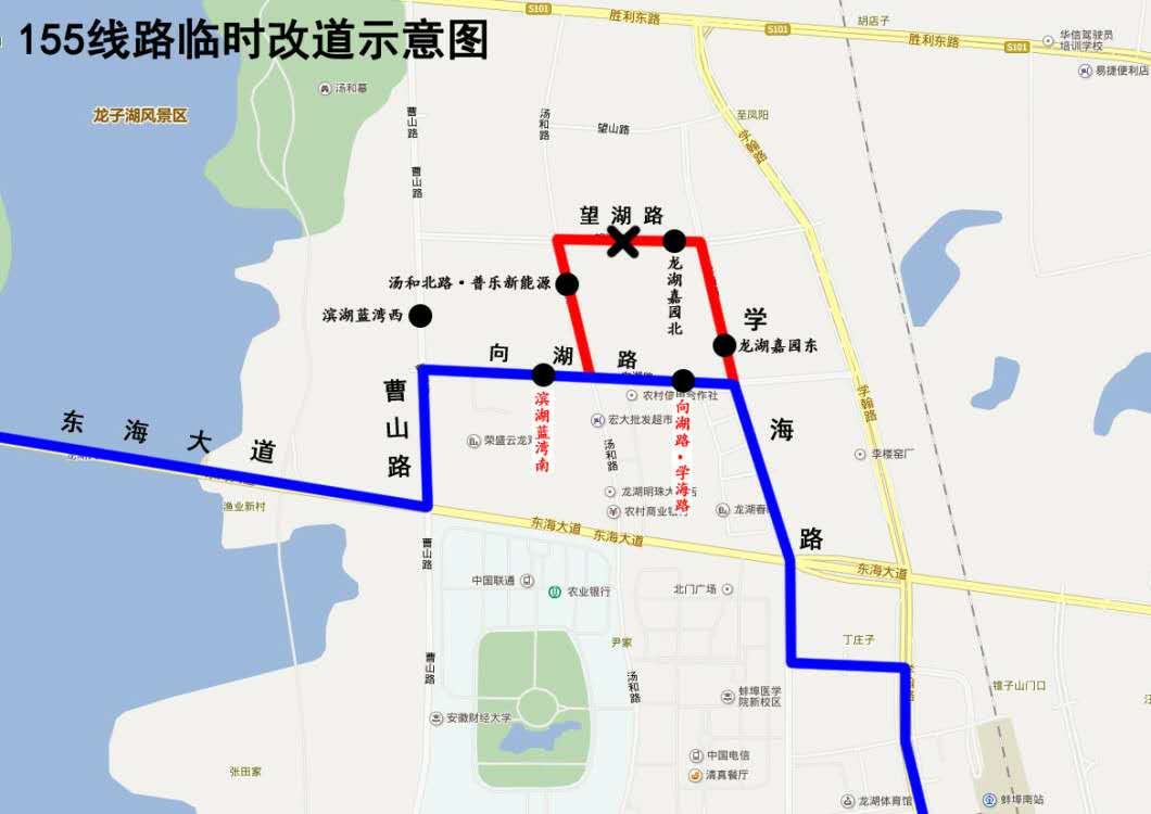 155路公交車改道公告 因湯和路與望湖路交叉口封閉施工,自5月2日起,公交155路來(lái)回雙向改道為:原線路—東海大道—曹山路—向湖路—學(xué)海路—原線路。 改道期間,公交車將取消“龍湖嘉園東”、“龍湖嘉園北”、“濱湖藍(lán)灣北”、“濱湖藍(lán)灣西”站,公交車臨時(shí)停靠“向湖路·學(xué)海路”站。封閉施工結(jié)束后恢復(fù)原線。